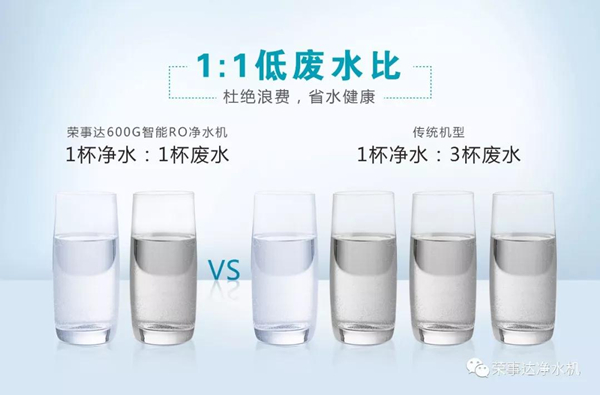 眾所周知,走心的產品總是以攻克消費痛點為目標。面對當前凈水市場主流的1:3廢水比難題,榮事達打破傳統廢水排放技術,通過科技創新,實現了1:1超低廢水比,600G智能反滲透凈水機出水效率由25%翻倍提升至50%,大大減少廢水排放,不僅節能環保,而且也節省了每一個家庭的生活開支。