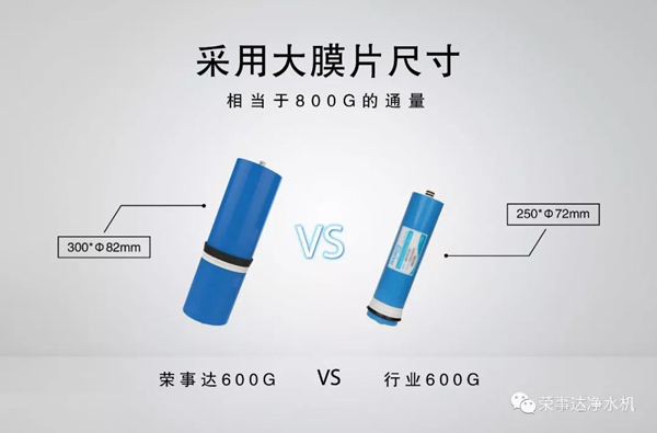 對于凈水機配件的選擇,榮事達一直是認真的。此次600G智能反滲透凈水機在核心部件RO反滲透膜的挑選上,就直接摒棄市場上主流的常規RO膜濾芯,采用專業定制化濾芯。 300Xφ82毫米獨特大膜片搭配專業卷膜技術,性能更為出眾,600G濾芯相當于800G濾芯通量,制水速度快,同時可充分凈化余氯、細菌、重金屬等有害物,出水可達直飲標準。