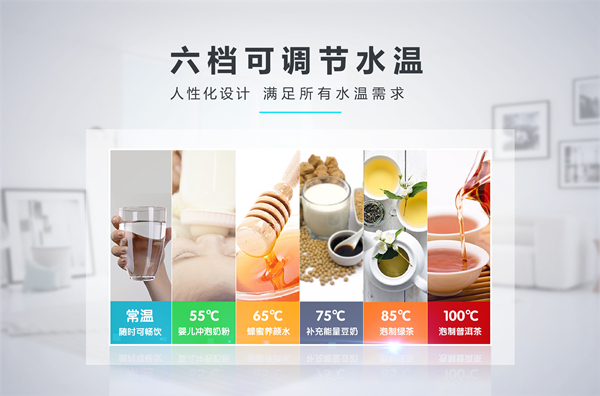 飲水機以加熱飲水為根本,不同的生活場景對于水溫的需求也各不相同。傳統(tǒng)飲水機多為常溫水和熱水雙重選擇,使用限制較大。為提升產(chǎn)品的人性化體驗,榮事達(dá)智能溫?zé)犸嬎畽C采用六檔可調(diào)節(jié)水溫設(shè)定,常溫、55℃、65℃、75℃、85℃、100℃,不同水溫可以充分滿足大眾直飲、沖奶、泡茶等各類飲水使用需求,生活更為簡便。