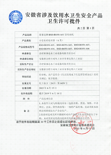 RSD-UF500超濾凈水機衛生許可...