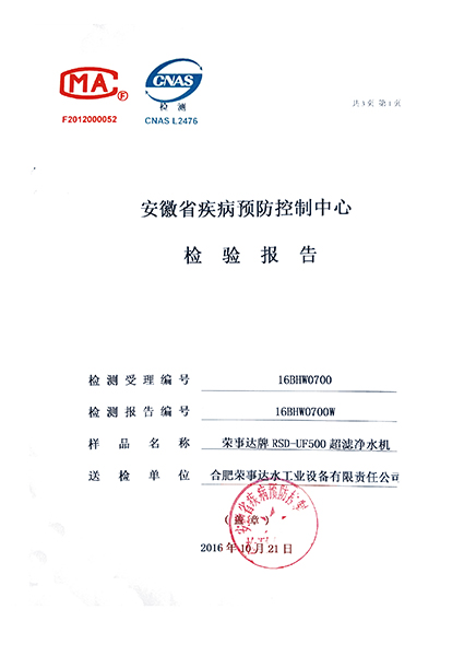 RSD-UF500超濾凈水機檢驗報告...