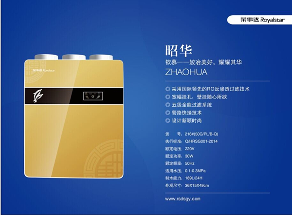 “昭華”被譽為凈水機中的“iPhone 6”,是榮事達產(chǎn)品研發(fā)的又一次華麗升級!它采用國際尖端科技的RO反滲透膜濾芯和管道快接技術。產(chǎn)品擁有RO反滲透膜的五級全能過濾系統(tǒng),能過濾掉水中的重金屬、病毒、細菌等有害物質(zhì);而各級濾芯、插頭均采用直插式設計的管路快接技術,杜絕了螺紋式濾芯、接頭受水錘現(xiàn)象長期影響而易變形漏水的可能。