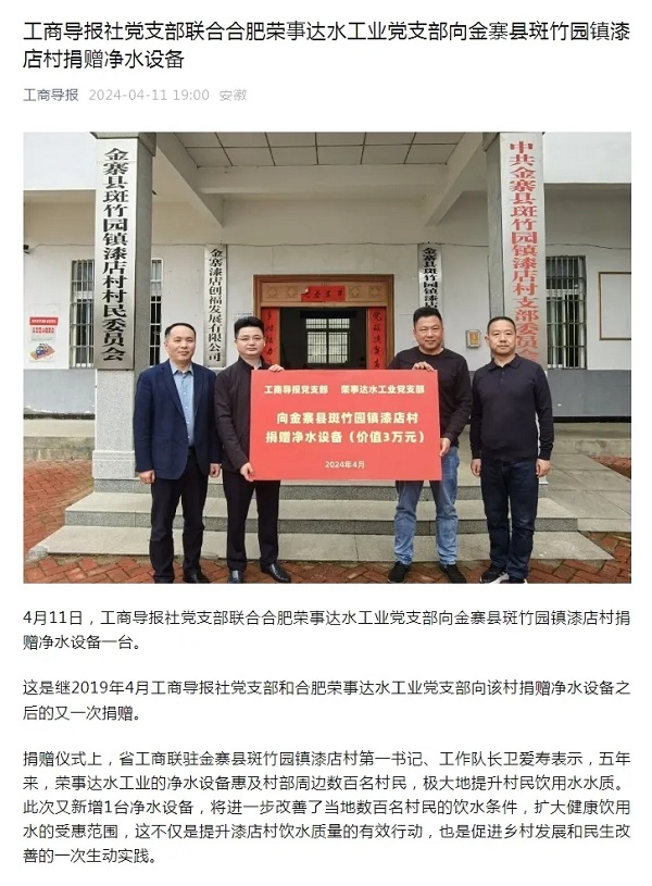 榮事達水工業(yè)公司一直積極響應國家號召,以“樂享凈水·助建美好鄉(xiāng)村”為主題,立足安徽,深入全國各地開展公益計劃,承擔企業(yè)社會責任。未來,公司將為更多鄉(xiāng)村帶去健康飲用水,為鄉(xiāng)村振興貢獻力量。▼工商導報相關報道▼