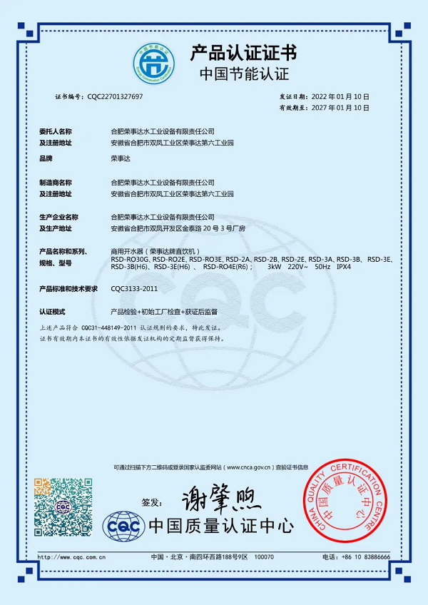 榮事達RSD-RO4E節(jié)能直飲機是中國節(jié)能認證產品,產品采用節(jié)能熱交換技術,在管式交換器內,過濾后的自來水吸收開水釋放的熱能升溫85℃左右,從而充分節(jié)省了降水燒開所需的電能和時間,有效改善了傳統飲水機的費時、費電的弱點。設備采用二開水二溫水設計,既滿足了員工泡茶的需求,也提供了即飲的溫水選項,極大地方便了員工的日常飲水。此外,設備采用先進的RO反滲透技術,有效濾除水中的泥沙、鐵銹、重金屬等雜質,出水可達直飲標準。